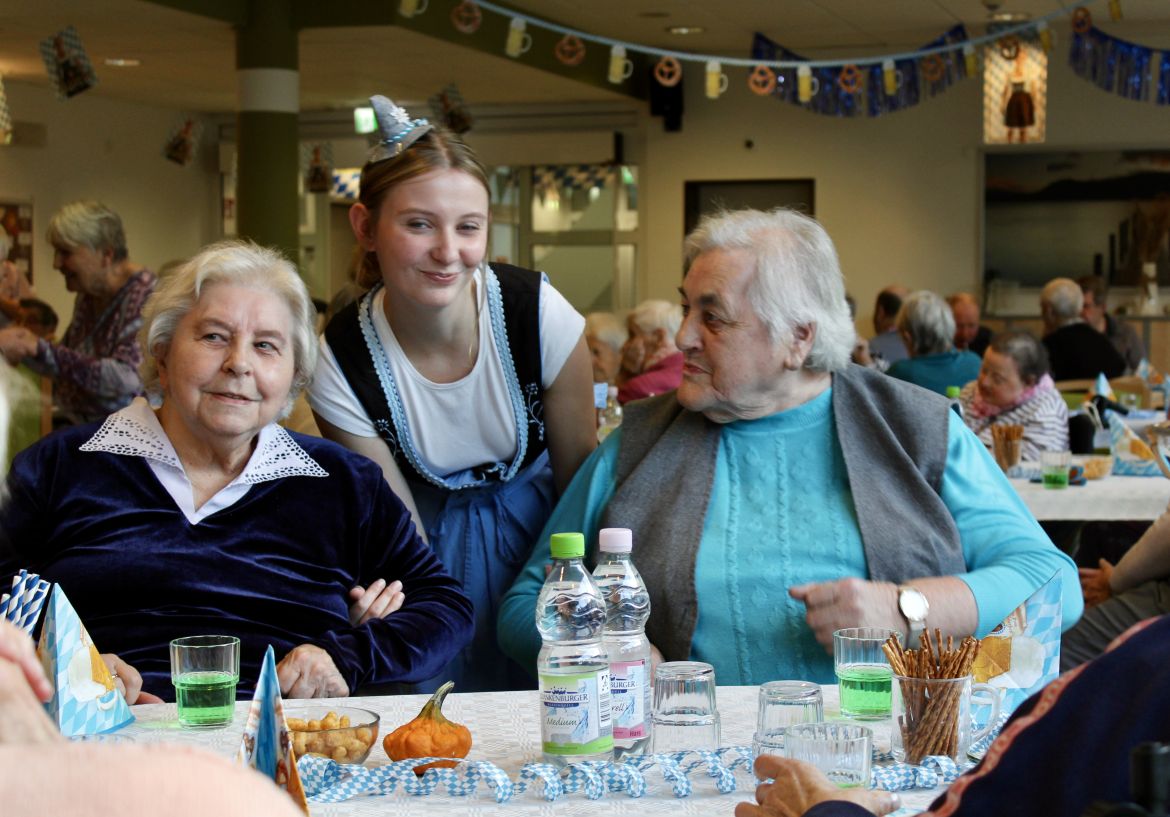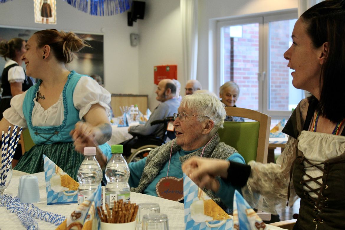 Gut einige Wochen nach dem offiziellen Oktoberfest verwandelte sich der Saal in unserem Pflegeheim „An der Beke“ in ein Meer aus Blau und Weiß und die Flure vibrierten im Rhythmus der Schlagerhits. Wir fuhren im knallroten Gummiboot atemlos durch die Nacht am Pferd auf dem Flur vorbei, baten Schatzi um ein Foto und bekamen einen Stern, der unseren Namen trägt. Es ist wohl der "1,2, Tipp"-Rhythmus, der macht, dass alle munter werden, das Tanzbein schwingen und die Hüfte kreisen lassen…